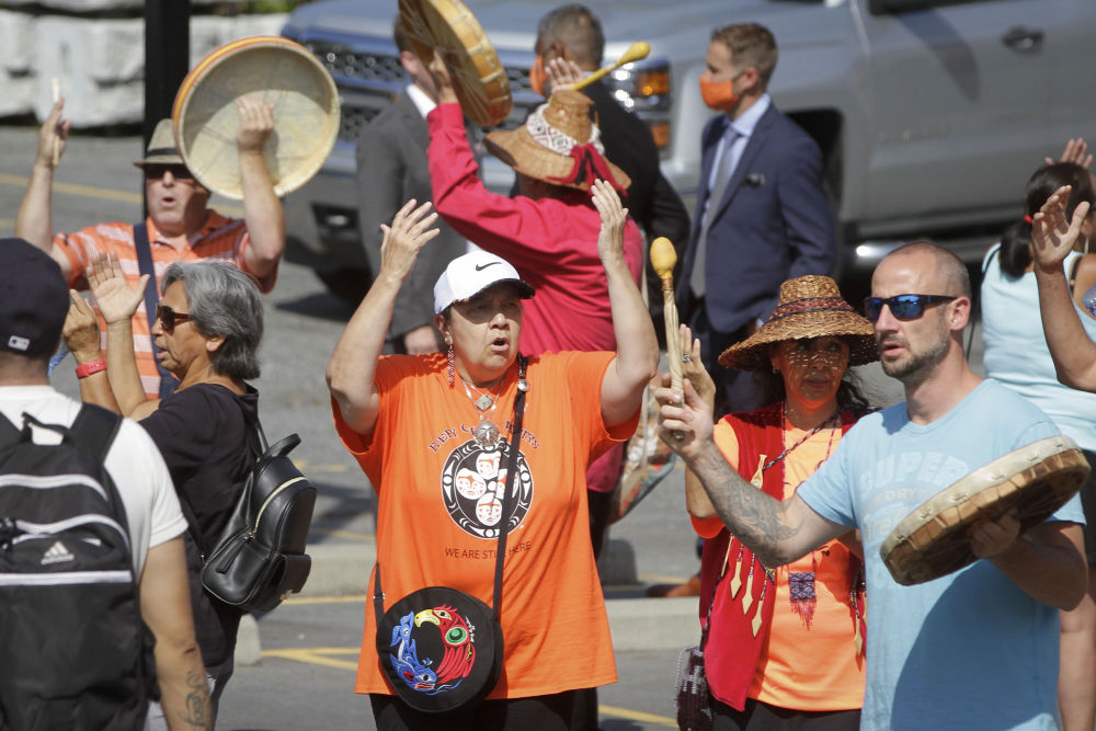 8月10日,在加拿大北温哥华“圣保罗印第安寄宿学校”旧址,人们在新闻发布会后击鼓、唱歌。加拿大不列颠哥伦比亚省的三个原住民部族10日宣布,将对位于北温哥华的“圣保罗印第安寄宿学校”旧址展开调查。(新华社发,梁森摄)