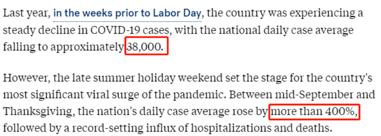 疫情发生以来的事实证明,节日假期向来是新冠病毒在美国各地传播的加速器。在去年劳工节前几周,美国的新冠肺炎病例曾有所下降,但节日假期为疫情反弹创造了条件。从去年9月中旬到感恩节,美国日均新增病例增加了400%以上,随后的住院和病亡人数都创下纪录。
