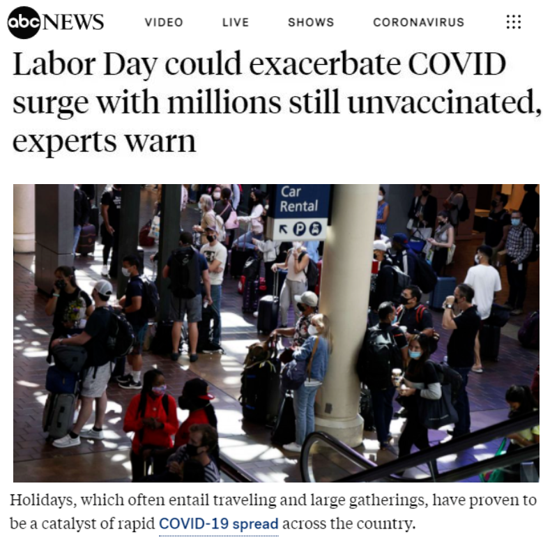 9月的第一个星期一,即9月6日是美国劳工节,也是美国夏季最后一个周末小长假。有了去年劳工节假期过后不久美国新冠肺炎病例出现激增的前车之鉴,卫生专家们开始了新的担忧。