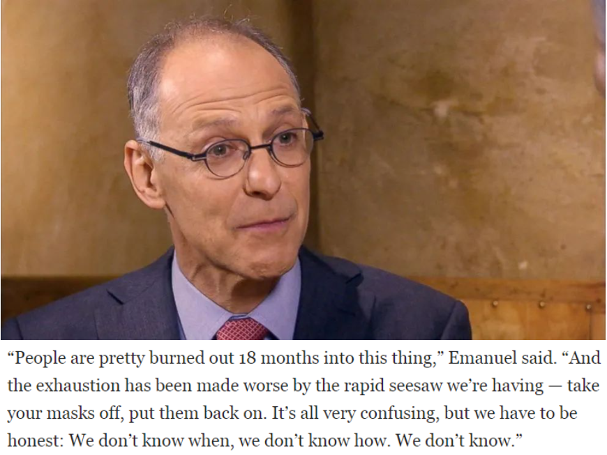 正如宾夕法尼亚大学教授伊泽基尔·伊曼纽尔所说,“人们在疫情暴发18个月后已经精疲力尽。而我们频繁进行的诸如‘摘下口罩,再重新戴上’这种‘跷跷板’做法进一步加重了人们的疲惫感。这一切都很令人困惑,但我们必须诚实:我们不知道疫情何时结束,也不知道疫情如何结束。我们什么都不知道”。