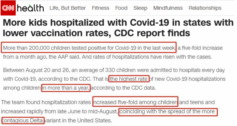 美国儿科学会(AAP)和儿童医院协会(CHA)发布的数据显示,从6月下旬到8月,美国儿童入院率增长了5倍。仅在过去一周,就有超过20万名儿童感染新冠病毒,为近一年以来的最高值。