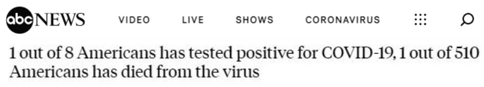 这意味着,大概每8个美国人中就有1人确诊新冠肺炎,每510个美国人中就有一人死于这种传染病。