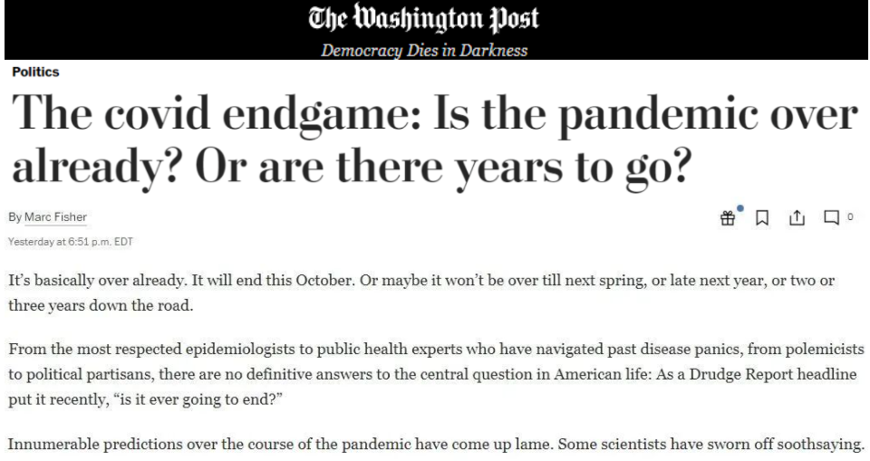 △《华盛顿邮报》文章称,美国有关疫情的预测已经有过“基本已经结束”“将于今年10月结束”“也许不会在明年春天结束”“明年晚些时候或者两三年后结束”等各种版本。这表明,从最受人尊敬的流行病学家到应对过去疾病恐慌的公共卫生专家,从辩论家到党派人士,对于美国生活中的一个核心问题都没有明确答案。