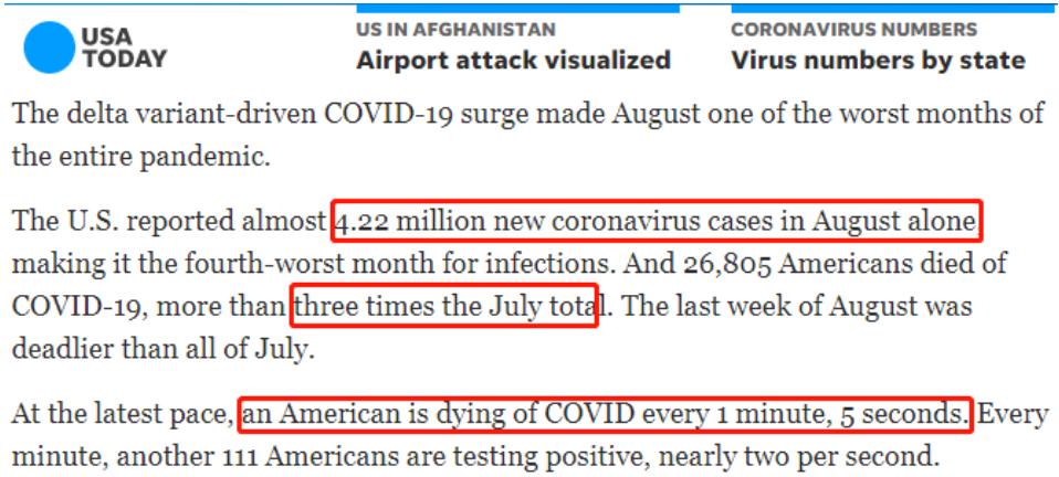 在刚刚过去的8月,美国报告了近422万例新增新冠肺炎确诊病例,病亡人数超过2.68万,是7月的三倍多。从疫情最新发展速度来看,每65秒钟就有一个美国人被新冠病毒夺去生命。