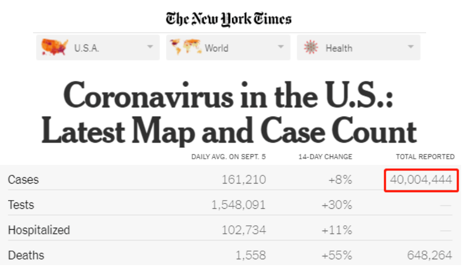 根据《纽约时报》疫情实时更新数据,截至北京时间6日上午,美国新冠肺炎累计确诊病例已突破4000万这个新的千万级关口,累计病亡人数也逼近了65万。