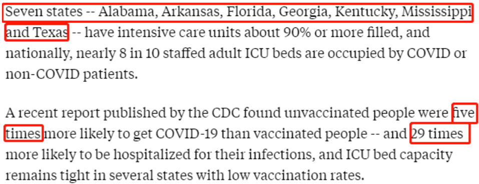 △据美国广播公司(ABC)报道,佛罗里达等7个州的成人重症监护病床占用率超过90%。美疾控中心研究发现,未接种疫苗者感染新冠病毒的可能性是接种疫苗者的5倍,因感染而住院的可能性是接种疫苗者的29倍。