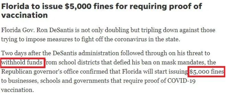 在疫情重灾区佛罗里达州,共和党籍州长德桑蒂斯仍在强硬反对一切正当防疫措施,在中断对坚持实行口罩令的学区提供资金支持之后,又打算对任何要求提供疫苗接种证明的企业、学校和地方政府开出5000美元罚单。