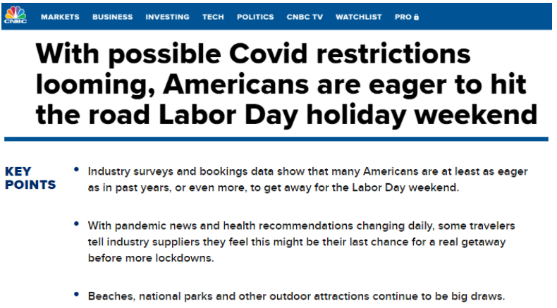 △美国消费者新闻和商业频道(CNBC)报道:尽管对疫情有所担忧,但很多人因为担心未来可能会有新的检疫规定或再次封锁,还是渴望在这个假期出行。