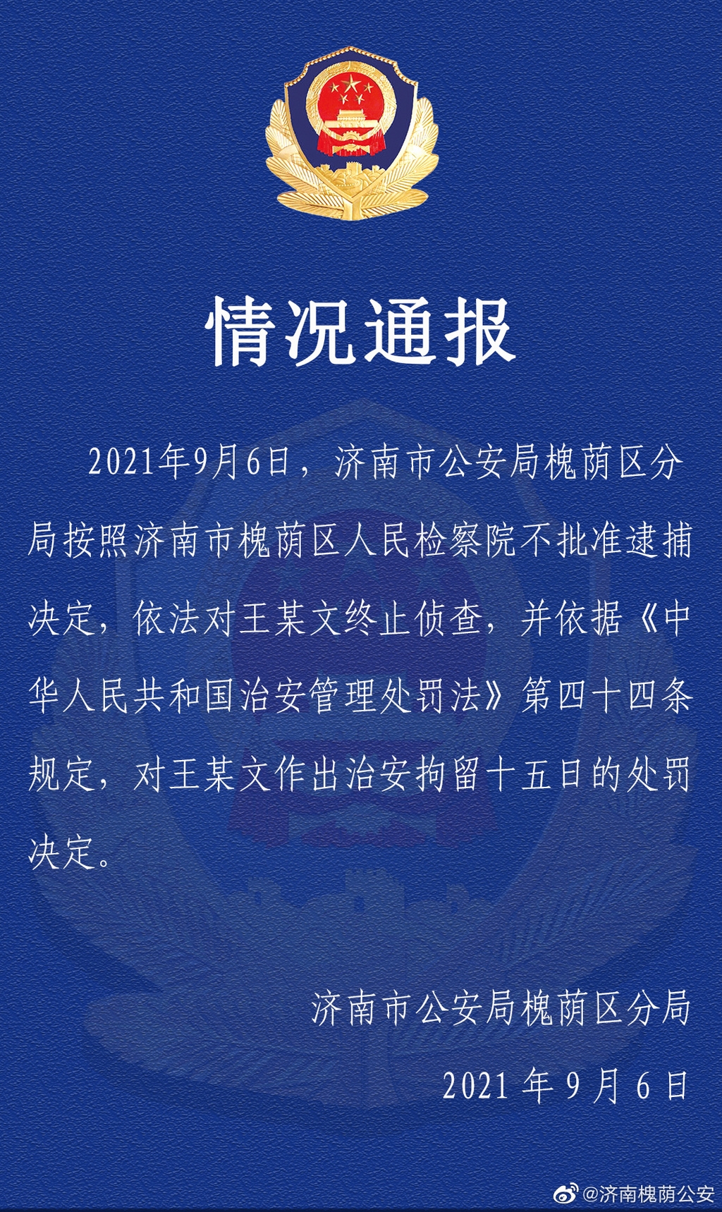 据济南公安槐荫区分局官方微博消息,依法对“阿里女员工被侵害”案中的王某文终止侦查,并对其作出治安拘留十五日的处罚。