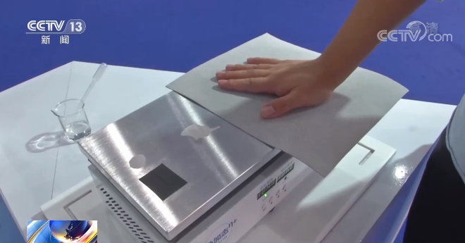 总台记者 王丰:今年的服贸会体育服务板块还展出了很多领域当中最新的科技和技术,比如就像这一款最新的材料,我们先给大家做一个实验,这是120度的炉温,水滴上去以后瞬间沸腾了,但是我们利用这款新的材料,手就可以这样放上来。