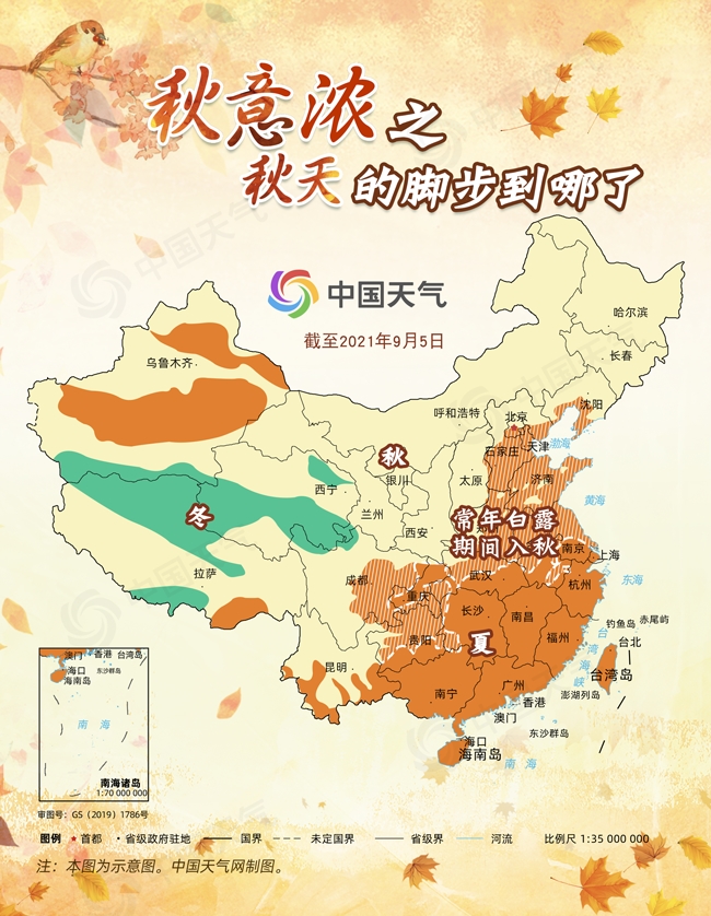 常年白露节气期间,北方冷空气活动频繁,大部地区秋意渐浓,华北将在此时节完成入秋进程,黄淮地区也全面开启夏秋转换;而在南方,特别是江南、华南地区还需警惕秋老虎,暑热还未真正消退。在西北地区东部及西南地区,是华西秋雨最为旺盛的时节,往往出现连绵的阴雨天;在华南沿海,则需警惕秋台风的影响。
