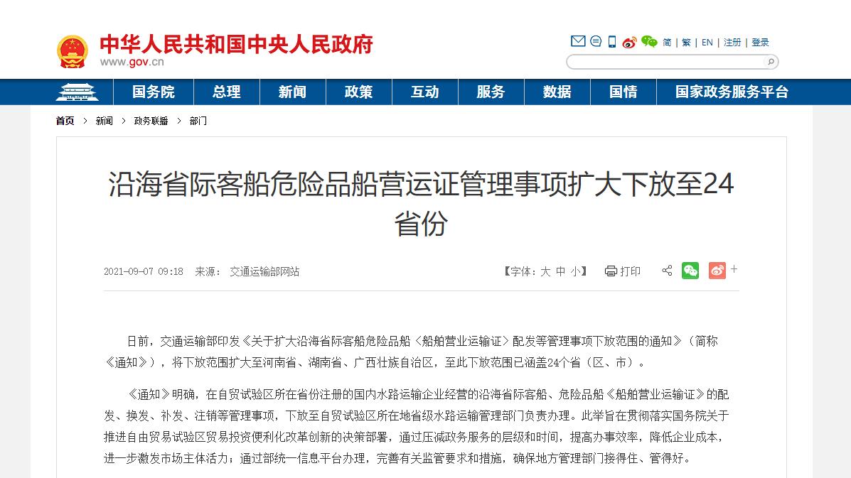日前,交通运输部印发《关于扩大沿海省际客船危险品船〈船舶营业运输证〉配发等管理事项下放范围的通知》(简称《通知》),将下放范围扩大至河南省、湖南省、广西壮族自治区,至此下放范围已涵盖24个省(区、市)。