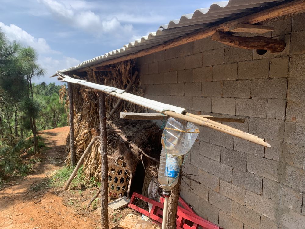 在村民来毛定家,一根被板材包裹的竹竿斜搭在屋檐下,悬着割开的塑料瓶,瓶口接着软管,连接处有泥土淤堵痕迹,软管另一端直通后院旱厕旁的水窖。