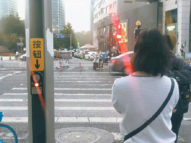 晚上9点,在西城区太平桥大街与什坊小街交会路口,仍不时有三五成群的行人在等待过马路。由于过街需要穿越6条机动车道以及两条非机动车道,距离较长,路中央还设置了二次过街岛,路两侧和过街岛上3处信号灯均有过街按钮。红灯时按下按钮,信号灯下方会立刻出现红色“等待”二字。