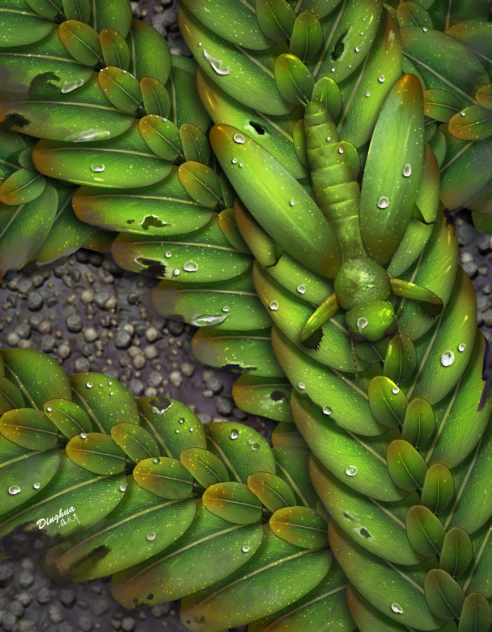 王氏拟叶蚤蝼和半翅目蟾蝽科昆虫的生态复原图。(杨定华绘制,中科院南古所供图)