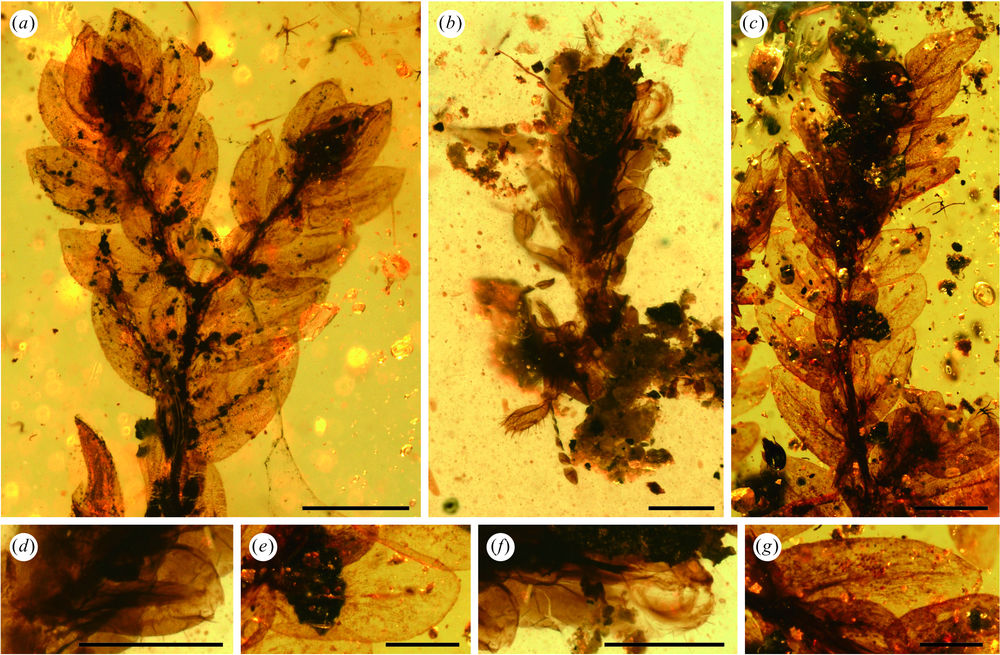 王氏拟叶蚤蝼(编号b、d、f)与卷柏类植物(编号a、c、e、g)的显微镜图。(中科院南古所供图)