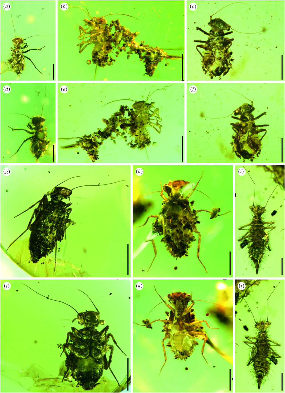 研究还发现了7枚覆物伪装昆虫,包括6枚啮虫目昆虫和1枚半翅目蟾蝽科昆虫。其中,蟾蝽科昆虫的背上覆盖有大量的碎屑物,包括土壤颗粒、砂砾和植物碎屑等,极有可能是利用背部的刚毛将碎屑物质粘在其背上。研究还发现在有花植物大辐射之前,一些昆虫已经演化出了覆物伪装这一复杂行为。