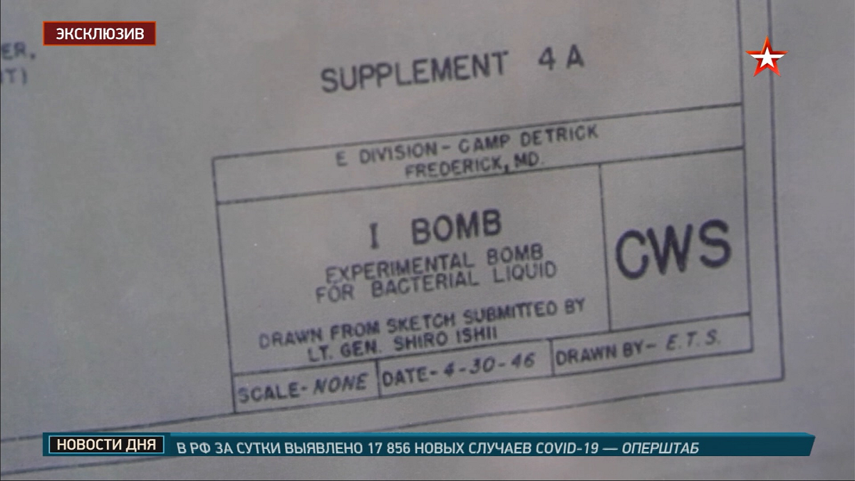 哈尔滨陈列馆中展示的细菌炸弹弹头的设计图纸副本上盖着美国德特里克堡制作的印章,上面写着设计图草图正是由731部队石井四郎提供。