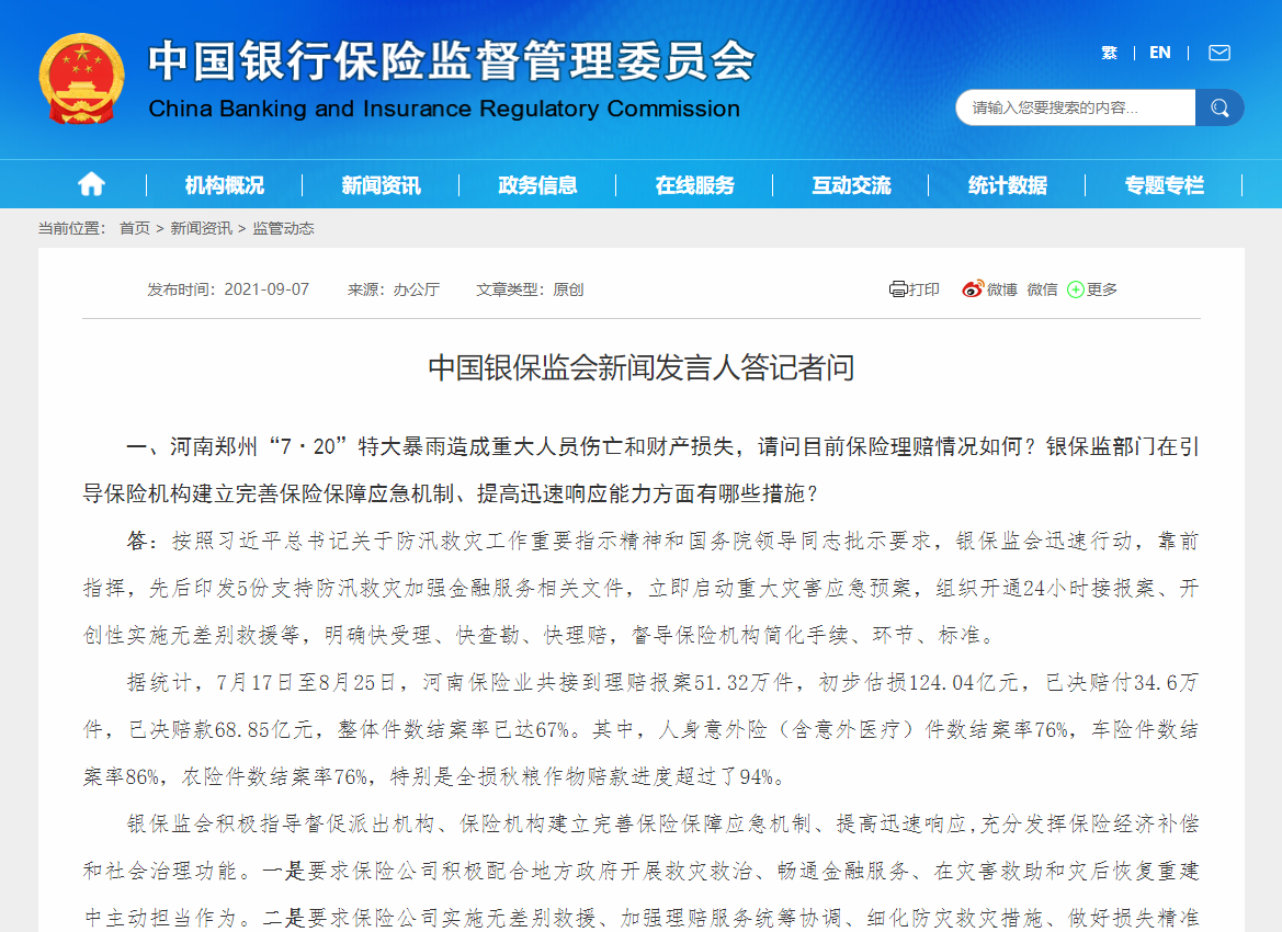 9月7日,银保监会发言人在答记者问中介绍了河南郑州“7·20”特大暴雨的相关保险理赔情况。