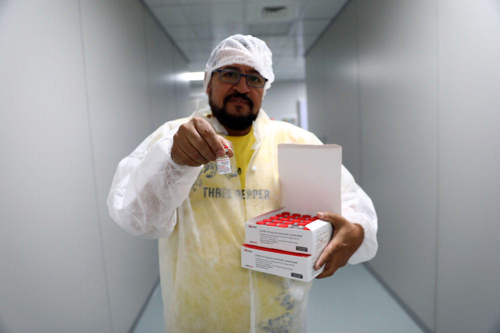 经过药液注射、贴标等生产线自动化流程后,这些带有VACSERA-Sinovac标签的小药瓶便由戴着医用头套、口罩、手套的工作人员整理后放入特制冰箱中保存。