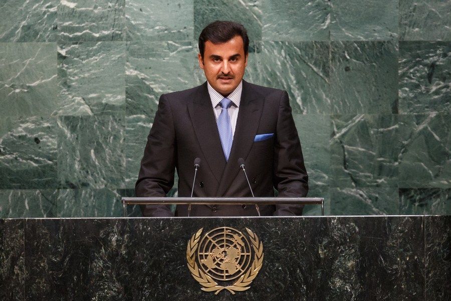 2015年9月28日,在纽约联合国总部,卡塔尔埃米尔塔米姆在联大一般性辩论上讲话。(新华社记者李木子摄)