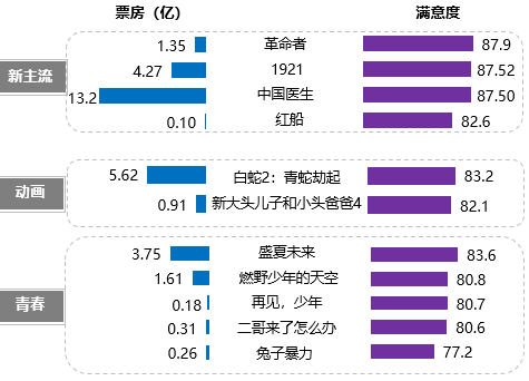 调查显示,《革命者》《1921》《中国医生》三部影片的满意度得分分别为87.9分、87.52分、87.50分,分列2021年暑期档影片满意度排序的前三位。动作片《怒火·重案》、青春片《盛夏未来》和动画片《白蛇2:青蛇劫起》满意度居档期第4至6位。