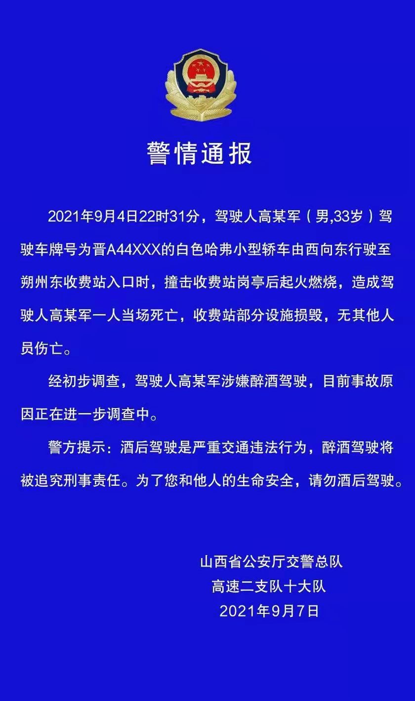 9月7日,山西省公安厅交警总队高速二支队十大队对外通报:9月4日22时31分,驾驶人高某军(男33岁)驾驶车牌号为晋A44XXX的白色哈弗小型轿车由西向东行驶至朔州东收费站入口时,撞击收费站岗亭后起火燃烧,造成驾驶人高某军一人当场死亡,收费站部分设施损毁,无其他人员伤亡。经初步调查,驾驶人高某军涉嫌醉酒驾驶,目前事故原因正在进一步调查中。
