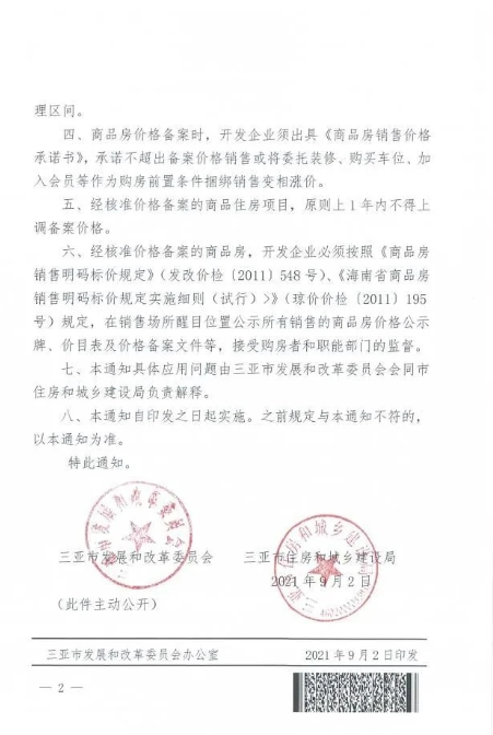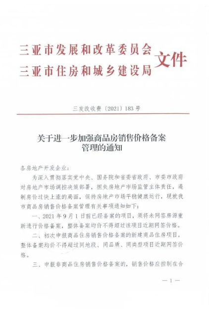 记者从海南省三亚市发改委获悉,三亚市发展和改革委员会和三亚市住房和城乡建设局近日发布《关于进一步加强商品房销售价格备案管理的通知》,明确经核准价格备案的商品住房项目,原则上1年内不得上调备案价格。
