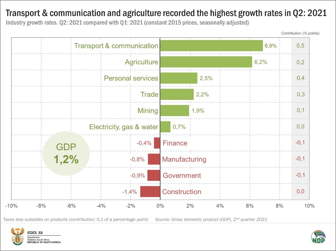 南非统计局9月7日公布的第二季度国内生产总值(GDP)数据显示,南非2021年第二季度国内生产总值(GDP)增长1.2%,超出此前大多数经济学家的预期,这也是南非经济连续第四个季度实现正增长。
