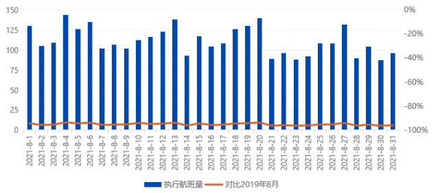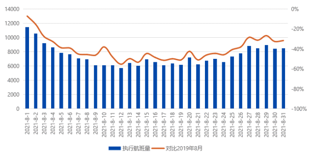 受本轮疫情影响,2021年8月,中国内地航线日均执行航班量约为7,413班次,环比降低39.91%;月度总体航班量跌落至2019年同期约6成水平,单日最低谷为8月12日,航班量降至5706班,仅为2019年同期的45%。