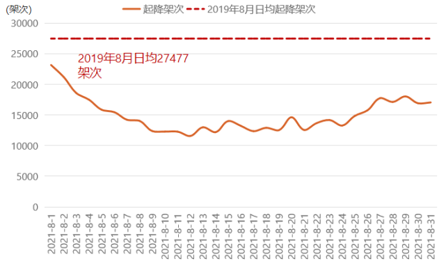 2021年8月中国内地运输机场完成客运航班起降约46万架次,日均量约为14,986架次,单日最低谷降至12,000架次以下;随着多地机场复航,月末起降架次呈回升态势。