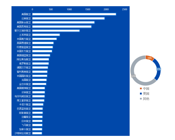 中国3家航司上榜,占比10%,分别为南方航空、东方航空和中国国航。美国有8家航司上榜,占比27%。