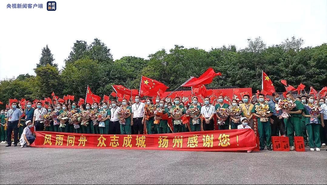 目前,扬州疫情防控保持向好态势,进入扫尾阶段,正在向常态化过渡,医疗队员们也陆续回家。9月6日下午驰援扬州的第四批医疗队员离开,离别之际460万扬州人民向他们表达感谢:谢谢你们,与我们风雨同“州”。