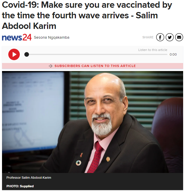 据南非媒体当地时间9月7日报道,南非流行病学和传染病专家萨利姆·阿卜杜勒·卡里姆(Salim Abdool Karim)教授呼吁民众尽快接种疫苗避免在即将到来的第四波疫情中感染新冠病毒。