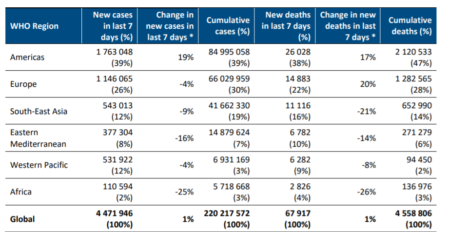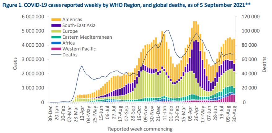 当地时间7日,世卫组织发布新冠肺炎每周流行病学报告,上周(8月30日至9月5日)全球新冠肺炎新增确诊病例超过447万例,除美洲区域新增病例数量增加,其他区域新增病例均出现下降。新增死亡病例近6.8万例,数量与前一周相近。