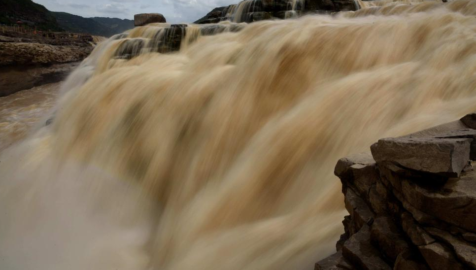 山西吉县,白露时节,受上游降雨增多影响,黄河干流水量大增,滔滔河水奔腾而下,壶口瀑布再现瀑布群景观,浊流翻滚,气势磅礴。