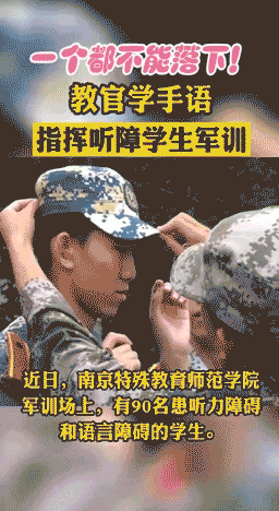 超暖!在南京特殊教育师范学院军训场上,有90名患听力障碍和语言障碍的学生。为更好地沟通,战士崔高旗特地学习了手语,耐心纠正学生动作,用导调旗指挥方阵,带学生们完成无声的军训。他说,“一个都不能落下!”