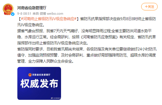 据河南省气象台预报,河南省7天内天气晴好,没有明显降雨过程;全省主要防洪河道水势平稳,水库运行正常。经会商研判,按照《河南省防汛应急预案》有关规定,省防汛抗旱指挥部作出终止省级防汛IV级应急响应决定。