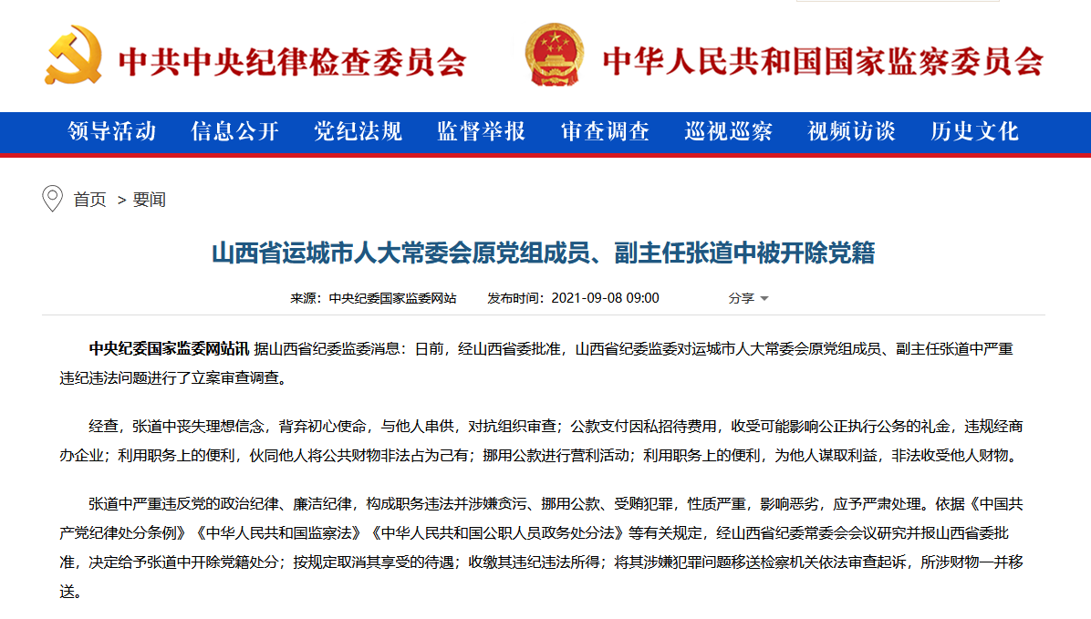 央视网消息:据中央纪委国家监委网站消息:日前,经山西省委批准,山西省纪委监委对运城市人大常委会原党组成员、副主任张道中严重违纪违法问题进行了立案审查调查。