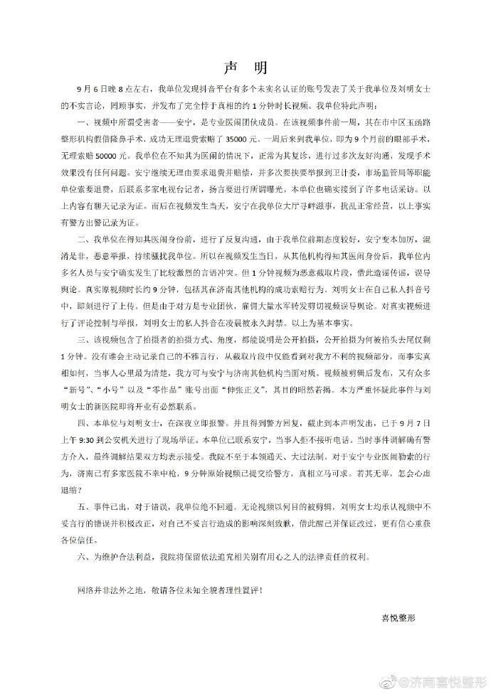 对此,9月7日,简介为“济南喜悦整形医院官方微博”的@济南喜悦整形 微博发布声明回应称,视频中那名女顾客安某是医闹,背后有专业的团队在操纵炒作此事,此事医院已经向警方反映。对于视频中自己的不妥言行,整形机构当事人已经承认错误并将积极改正。(来源:界面新闻)