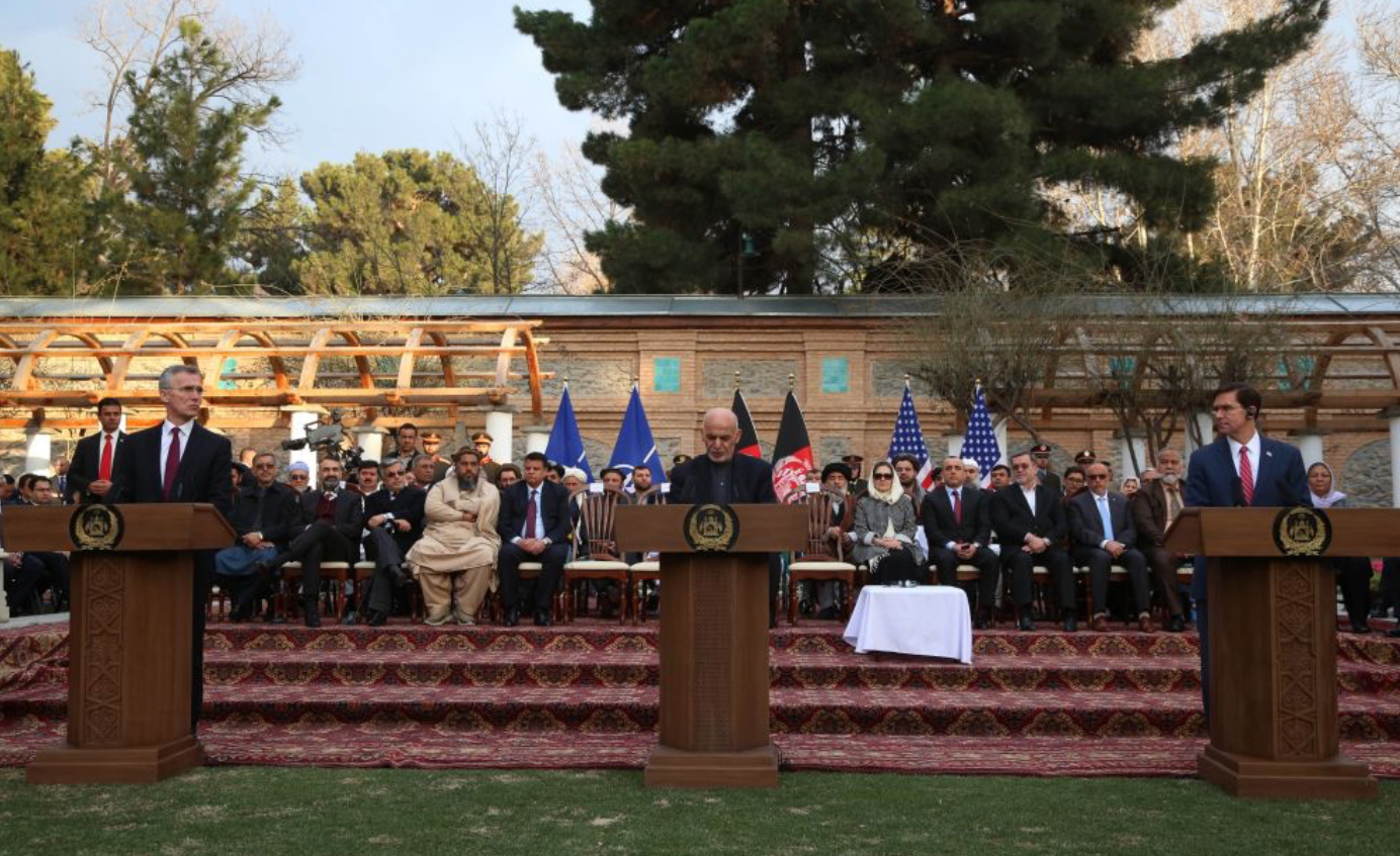 2020年2月29日,在阿富汗首都喀布尔,时任美国国防部长马克·埃斯珀(前右)、阿富汗总统阿什拉夫·加尼(前中)和北约秘书长延斯·斯托尔滕贝格出席新闻发布会。当日,美国和阿富汗塔利班在卡塔尔首都多哈签署旨在结束阿富汗战争的和平协议。(拉赫马图拉·阿里扎达摄)