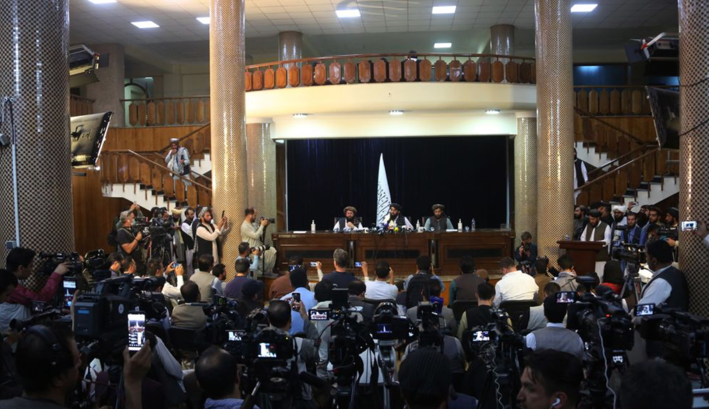 8月17日,在阿富汗首都喀布尔,阿富汗塔利班发言人扎比乌拉·穆贾希德(后中)出席塔利班进入喀布尔后举行的首次记者会。穆贾希德表示,塔利班计划在阿富汗组建一个包容性政府。