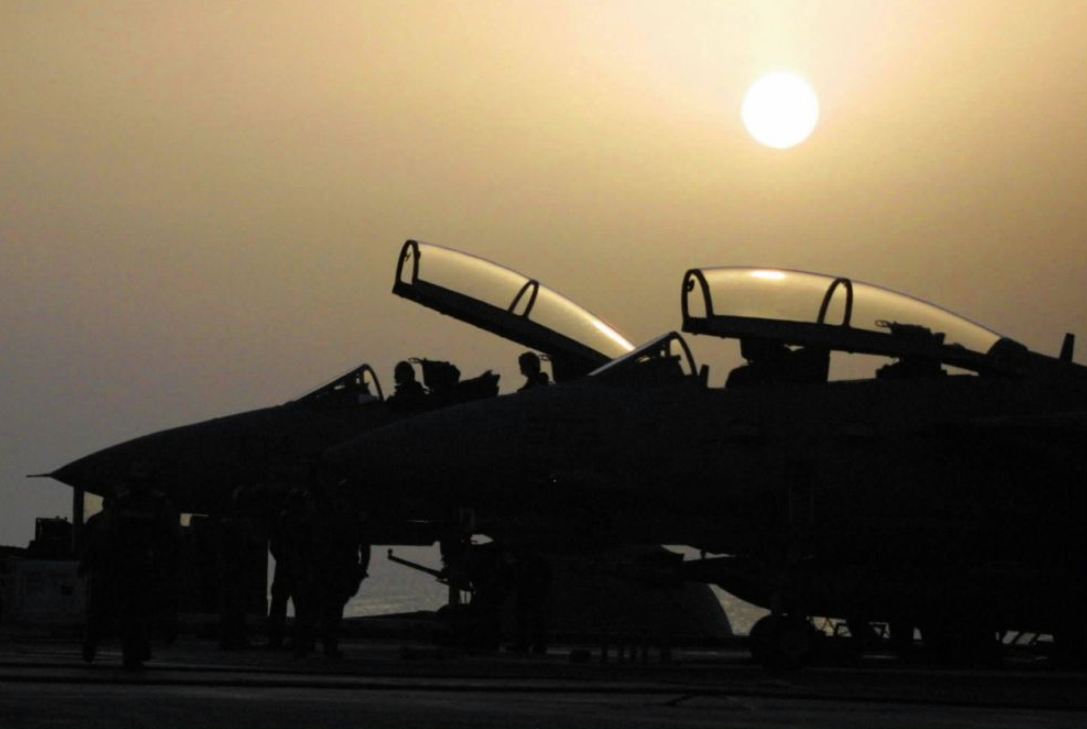 2001年10月15日,美国“企业”号航空母舰上F-14“雄猫”战斗机准备起飞,执行对阿富汗空中打击任务。