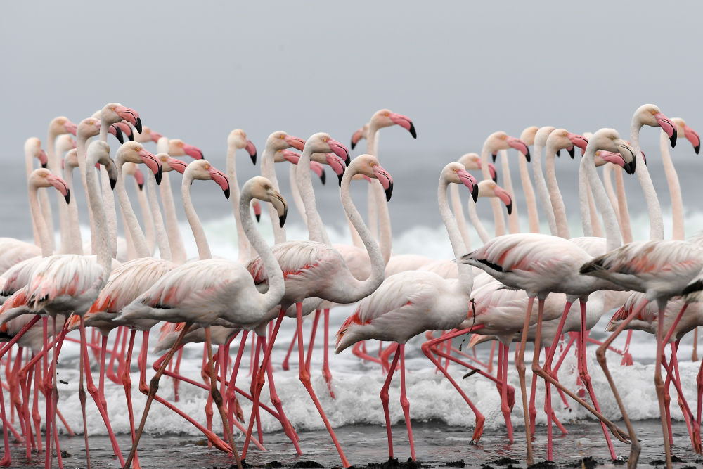 2019年9月26日,火烈鸟成群结队在纳米比亚鲸湾海边觅食。(新华社记者陈诚摄)