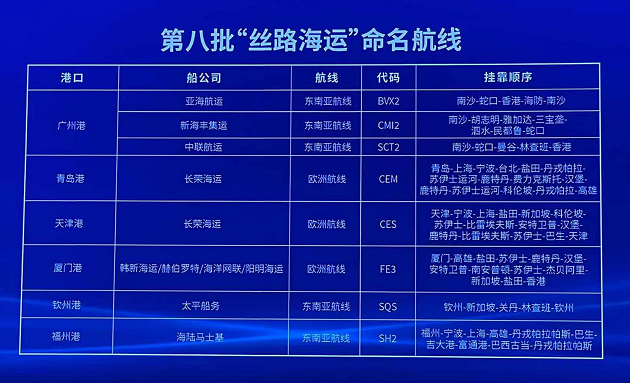 在成果展示中,天津、山东、福州、厦门、广州、广西五地八条航线作为第八批“丝路海运”命名航线。至此,全国“丝路海运”命名航线已达80条,通达27个国家的99座港口,为开拓“一带一路”高质量发展新航路,做出了积极的推进。(总台记者 韩志涛 陈庚 黄志豪)