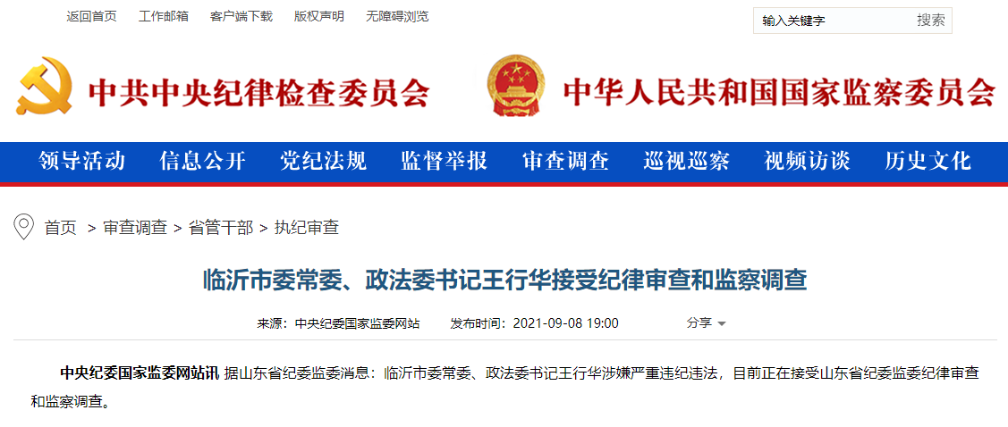 据山东省纪委监委消息:临沂市委常委、政法委书记王行华涉嫌严重违纪违法,目前正在接受山东省纪委监委纪律审查和监察调查。