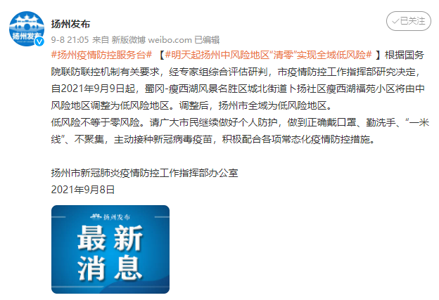 央视网消息:据@扬州发布官方微博消息,根据国务院联防联控机制有关要求,经专家组综合评估研判,市疫情防控工作指挥部研究决定,自2021年9月9日起,蜀冈-瘦西湖风景名胜区城北街道卜扬社区瘦西湖福苑小区将由中风险地区调整为低风险地区。调整后,扬州市全域为低风险地区。