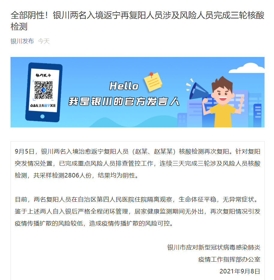 目前,两名复阳人员在自治区第四人民医院住院隔离观察,生命体征平稳,无异常症状。鉴于上述两人自入银后严格全程闭环管理,居家健康监测期间无外出,再次复阳情况引发疫情传播扩散的风险较低,造成疫情传播扩散的风险可控。