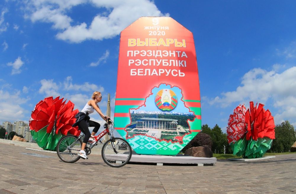 2020年7月26日,在白俄罗斯首都明斯克,一名女子骑自行车经过一处总统选举广告牌。(新华社发,任科夫摄)