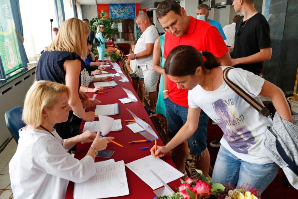 2020年8月9日,在白俄罗斯首都明斯克的一个投票站,选民领取选票。(新华社发,任科夫摄)